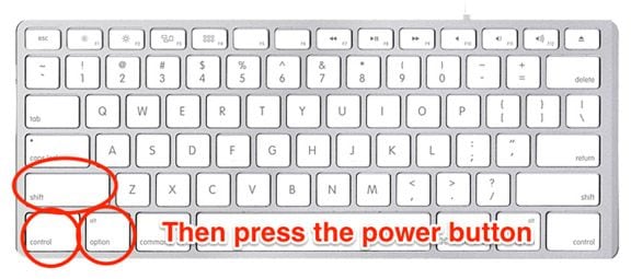 2. Una vez apagado, mantén pulsadas las teclas Shift + Control + Opción en el lado izquierdo de la placa. Ahora, pulsa el botón de encendido y mantén pulsadas todas las teclas durante otros 10 segundos.