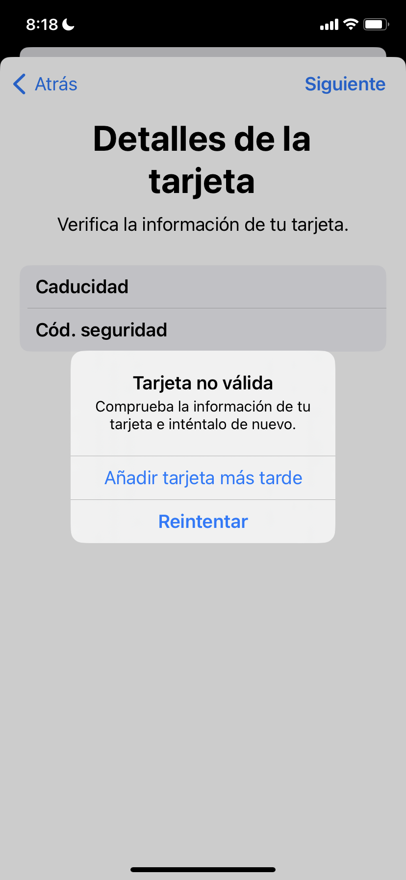 Si el problema persiste, puedes probar con ir a Ajustes > Cartera > Añadir tarjeta. Se te abrirá un menú con los tipos de tarjetas disponibles. Si esperas unos segundos debería salirte un apartado llamado Tarjetas anteriores.