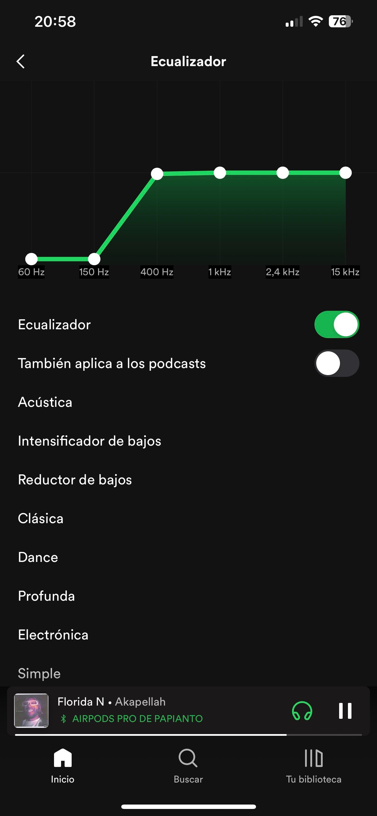 Esta App tiene un ecualizador interno, para acceder a él deberás ir a Configuración dentro de Spotify, luego Reproducción y por último Ecualizador, acá deberás fijarte que el Ecualizador esté apagado y que se vea una línea recta al centro de todos los parámetros.