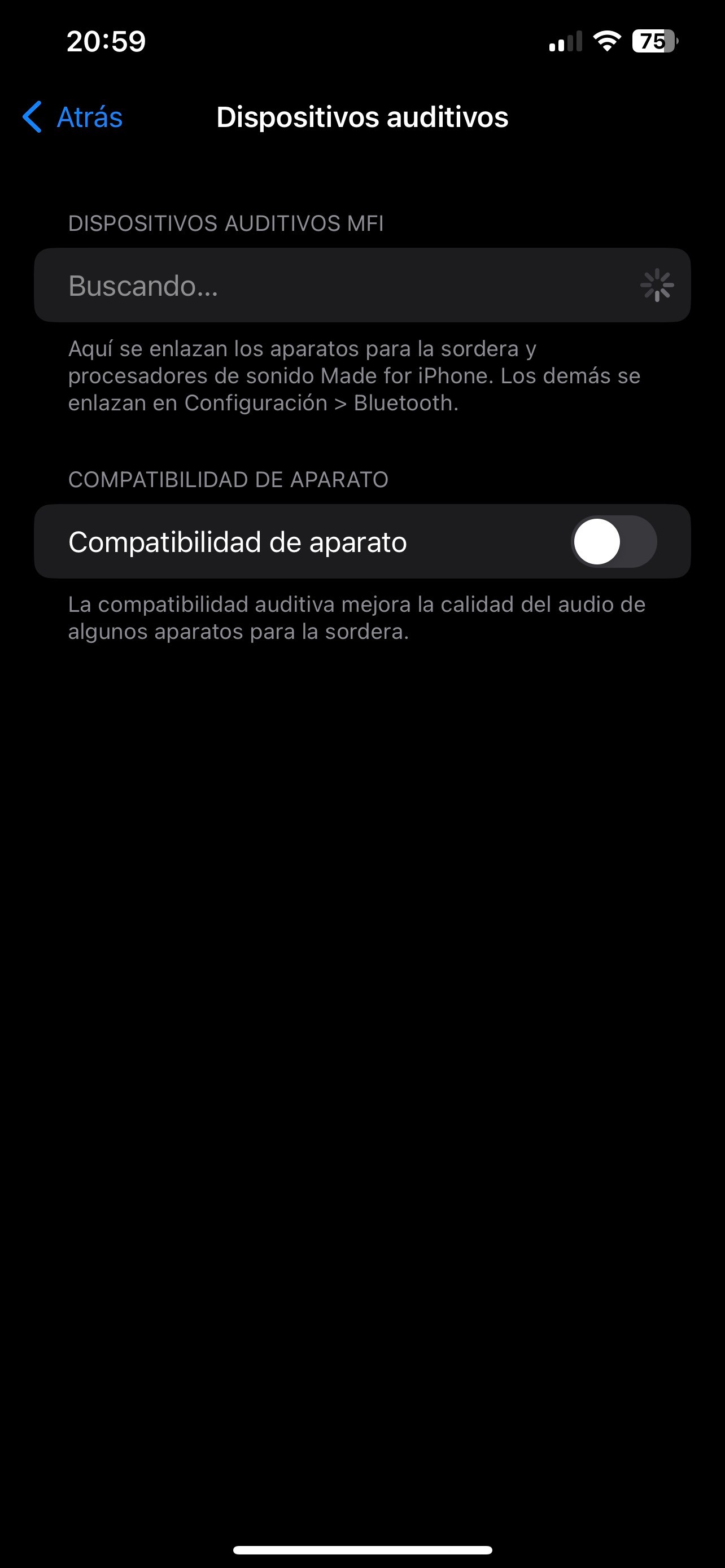 En el mismo menú de Accesibilidad, busca el apartado de Dispositivos Auditivos y desactiva Compatibilidad con el Aparato.