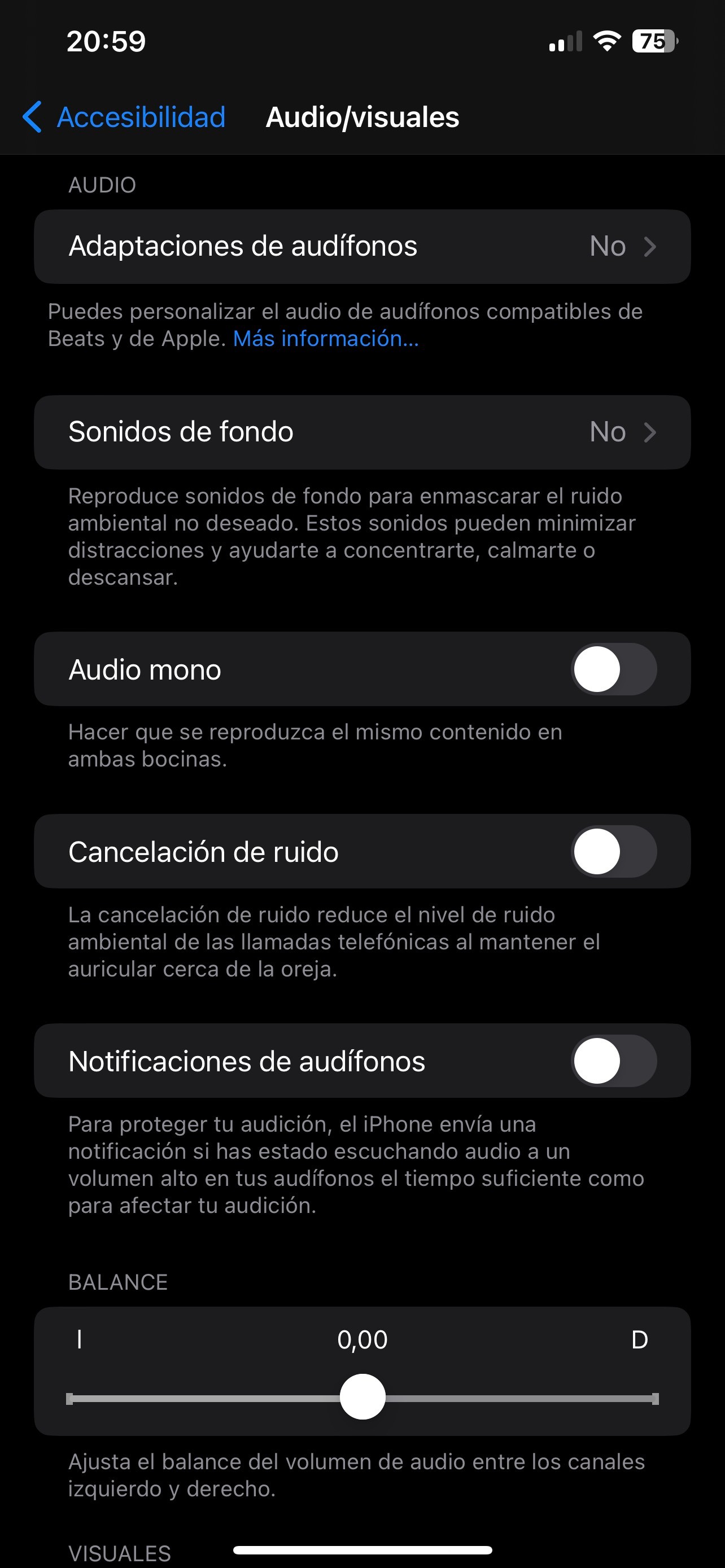 Si lo anterior aún no soluciona el inconveniente deberás ir a Configuración del iPhone > Accesibilidad > Audio / Visuales, y acá asegúrate que Adaptaciones de Audífonos esté desactivado, Audio Mono esté desactivado, el Balance esté en 0,00.