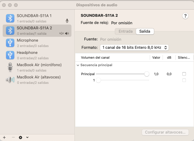 Buenas tardes, he conectado una barra de sonido bluetooth a mi MacBook Air (con chip Apple) y me ocurre que si la conecto a través de cable Jack, se escucha perfecta, utilizando sus dos altavoces internos (en estéreo), PERO si la conecto a través de bluetooth, se escucha entrecortado todo el tiempo a menos que modifique (en la configuración de audio midi) el formato de audio a 1 solo canal (mono). Evidentemente se escucha mucho peor y con un volumen bajo. Adjunto imagen de ambos formato (el que funciona bien y el que se entrecorta).