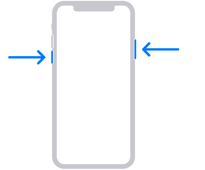 Desconecta el iPhone si esta conectado a un ordenador y mantén pulsado el botón lateral y el botón de bajar volumen hasta que aparezca el control deslizante de apagado.