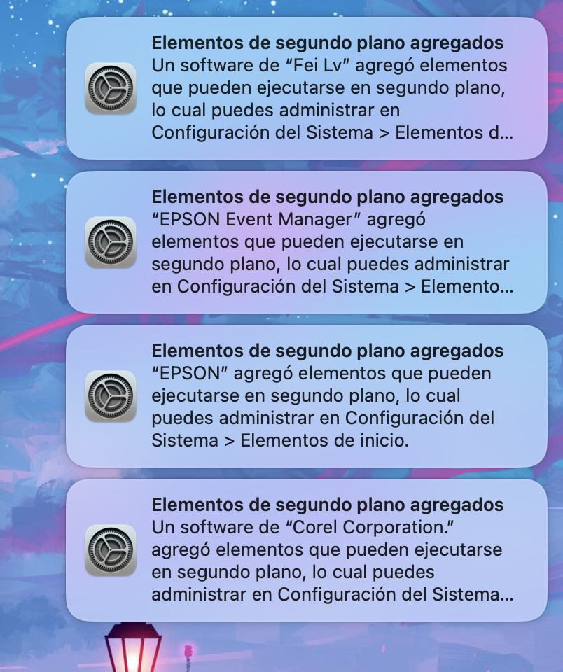 Desde que actualicé a Ventura, cada que inicio sesión aparece esta notificación indicando nuevos elementos con actividad en segundo plano, algunos son software que ya elimine y otros que utilizo mucho, he intentado activandolos de nuevo y no se soluciona; también cada vez que quiero desactivar otro que inicie al encendido se va agrandando la lista de notificaciones, he probado desactivas las notificaciones aunque sea y ni asi se soluciona, es molesto tener que ver toda una lista de notificaciones cada que inicio sesión o abro configuración, agradecería si alguien me pudiera ayudar, Gracias.