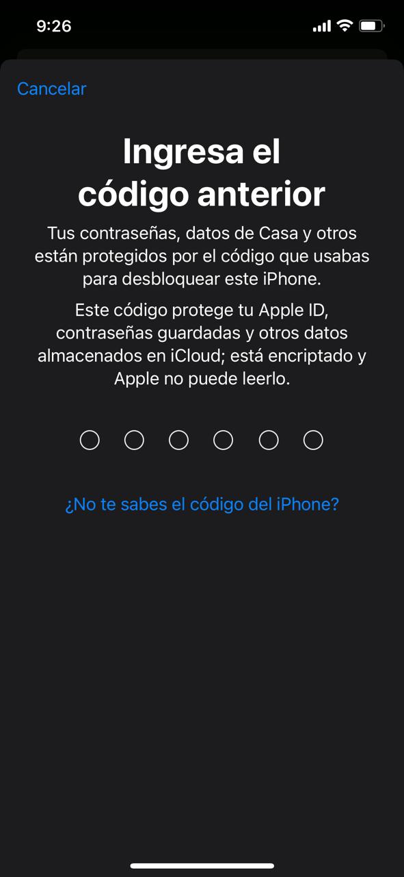 Prueba a ingresar el código anterior que tenías o si no lo recuerdas, es posible que tengas que restablecer el código para acceder a tu ID de Apple. Toca en ¿No te sabes el código del iPhone? y continúa los pasos.
