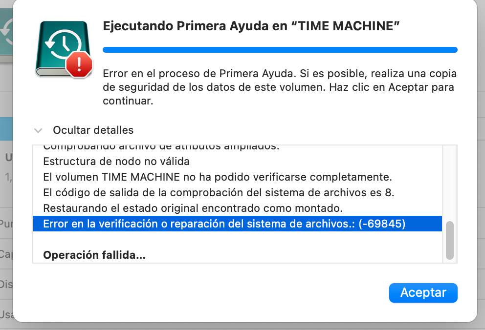 El disco de Time Machine que utilizaba y parece que se ha dañado, me da los siguientes errores.