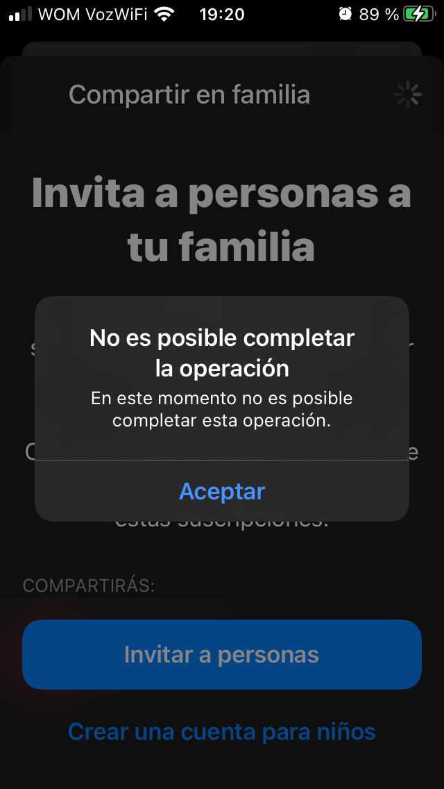 Hola, tengo contratado un plan familiar de Apple Music. Resulta que cuando quiero compartir o añadir gente a mi grupo familiar, me aparece que "no es posible completar la operación" (cómo aparece en la imagen de más abajo). Poseo un iPhone SE primera generación con iOS 15.7.9