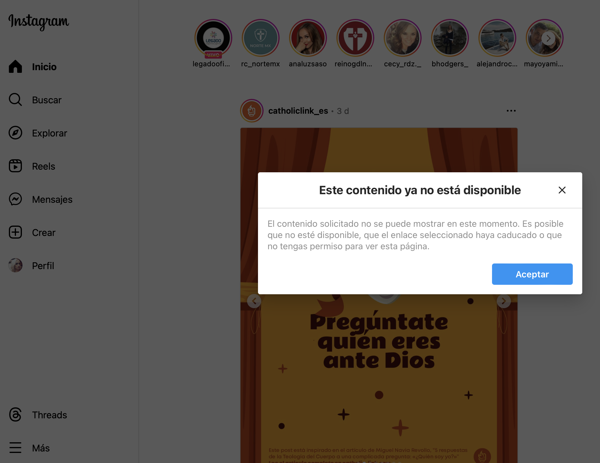 La página de la red social Instagram no funciona correctamente en el navegador Safari. Al iniciar arroja mensaje de "este contenido ya no está disponible".