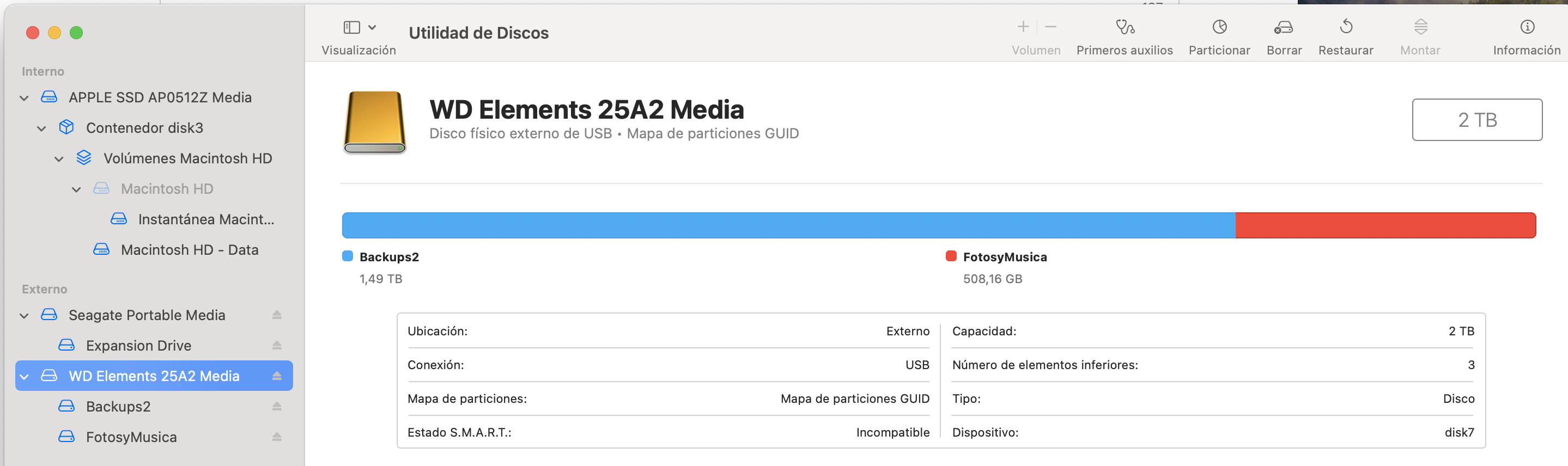 Buenos dias! Tengo un MacBook Air con OS Sonoma 14.2.1. Soy el unico usuario, por lo tanto el administrador. Pase un HD Externo de un equipo anterior a este, nuevo. Ese HD lo utilizo particionado entre Backups y archivo de fotos y musica. Tiene 2 TB.