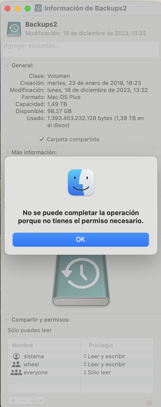 Al plugarlo al nuevo equipo, particioné el volumen de backups entre anteriores(respaldos del MBAir anterior) y el destinado a hacer backups del nuevo MBair. Al no completar ningun respaldo, veo abriendo la información del disco, que no tiene seteado poder escribir. Cuando intento cambiarlo, me dice que no tengo permiso para cambiar a Leer y escribir. Vean arriba el mensaje que da: