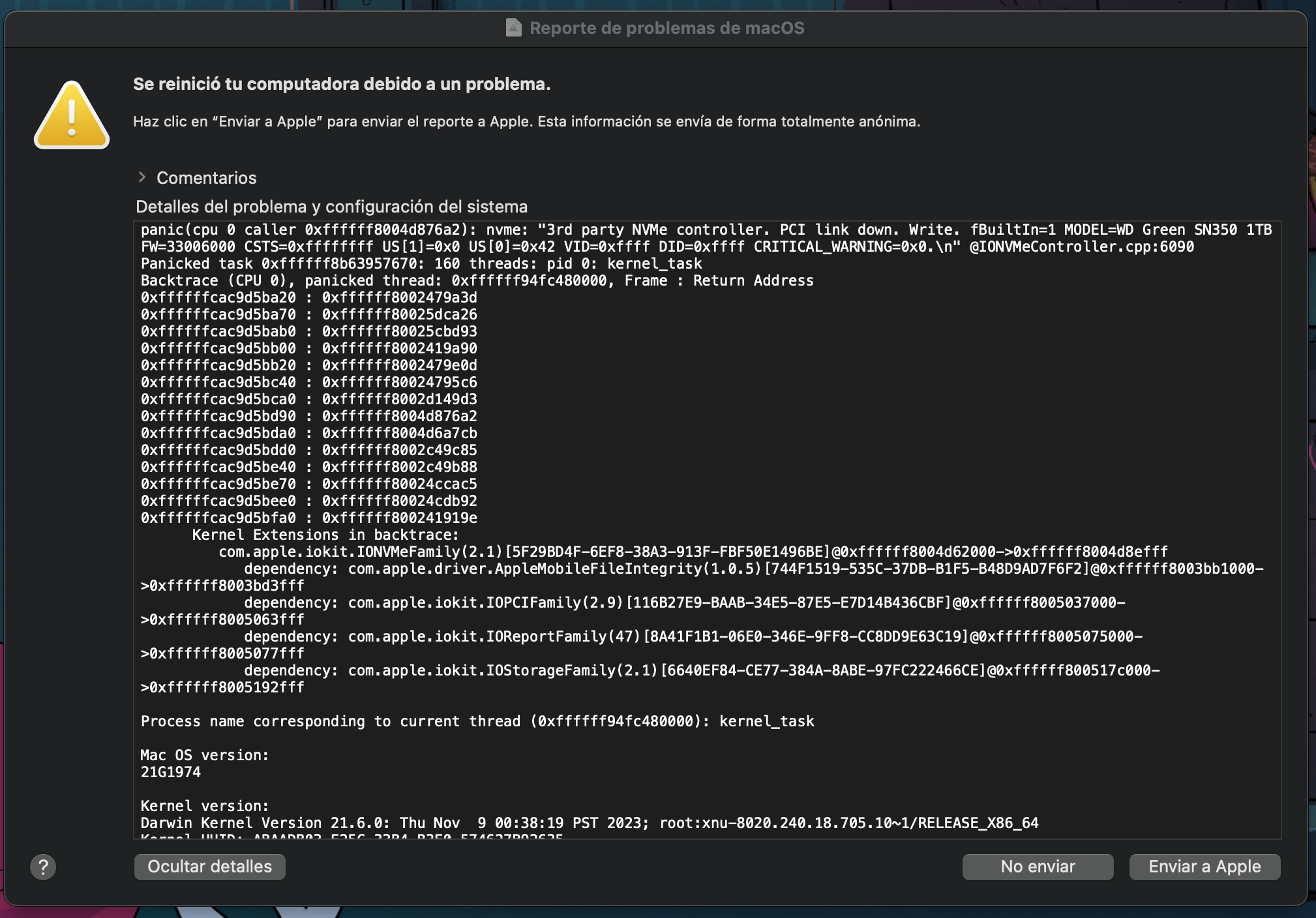 Macbook Pro 2015 y MacOS Monterey 12.7.2 (21G1974) presenta conflictos con mi NVME WD Green 1TB