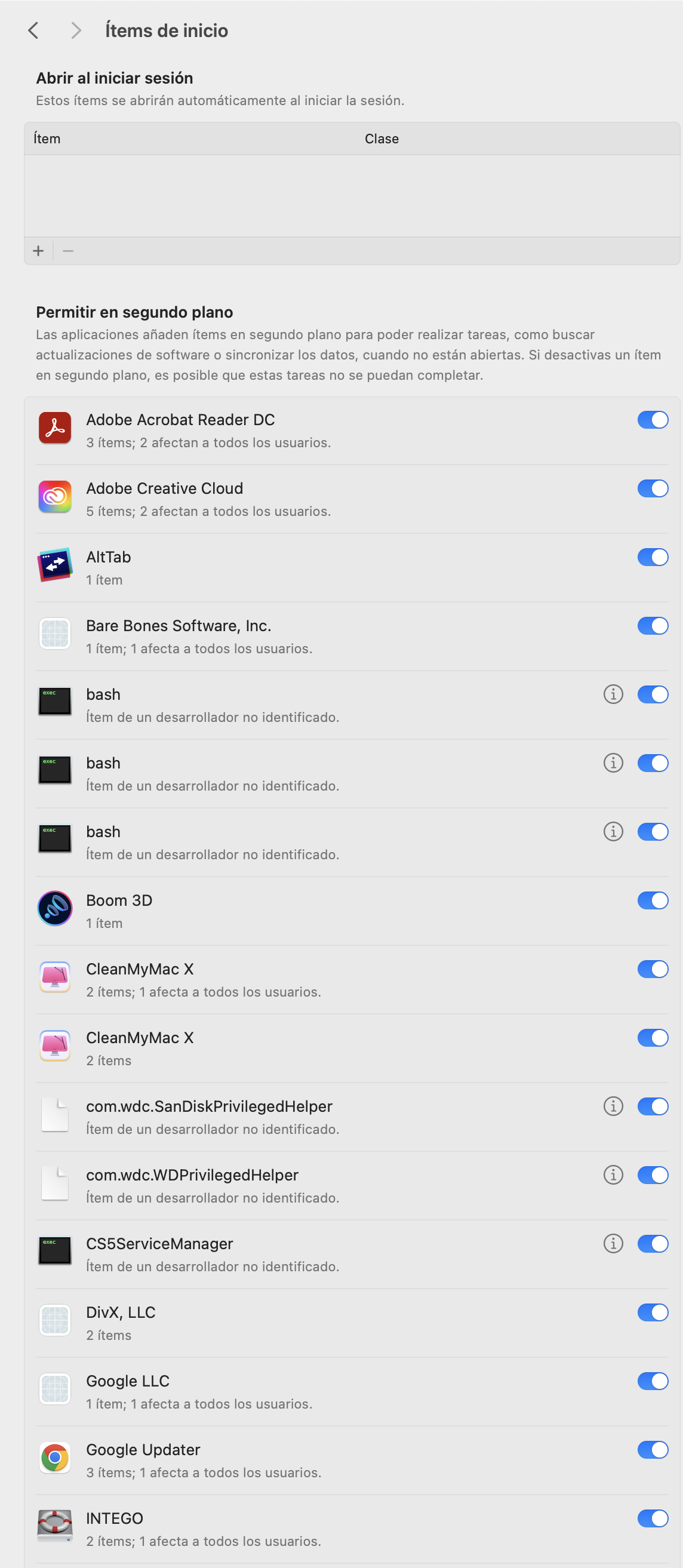 Otro detalle que no te comenté antes, y me acordé ahora: comprueba sin se carga de arranque alguna extensión en tu perfil. Vete a "Ajustes del sistema" > "General" > "Ítems de inicio" . Revisa ahí qué programas o extensiones se cargan de inicio en tu equipo. Mi recomendación es cuantas menos mejor.