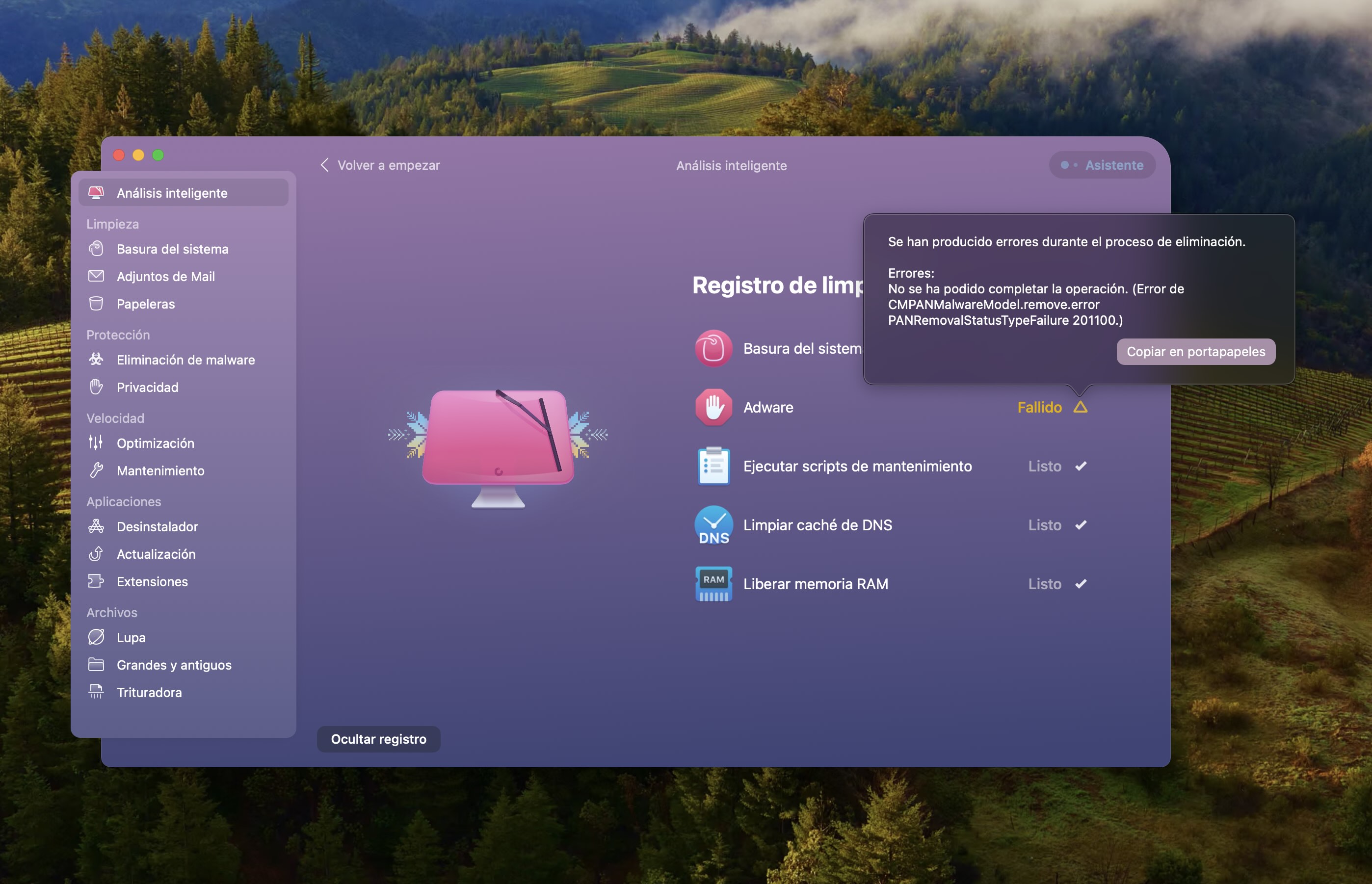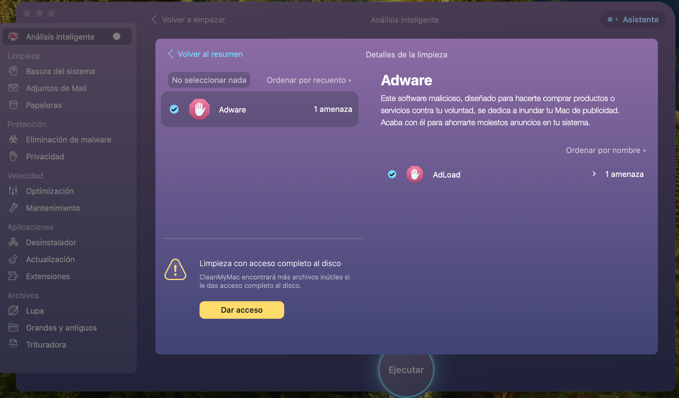 La aplicación CleanMyMac ha detectado el software malicioso Adware - AdLoad y no consigue eliminarlo.