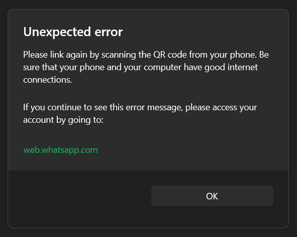 Yo también cuento con el mismo problema (sin embargo, tengo un iPhone 13). He de decir que estaba trabajando de maravilla hasta que cerré sesión en la apk de mi PC. Cuando quise volver a vincularlo, me aparecía ese ventana indicando un "error inesperado". He escrito a soporte de WhatsApp, pero nunca tuve respuesta por parte de ellos.
