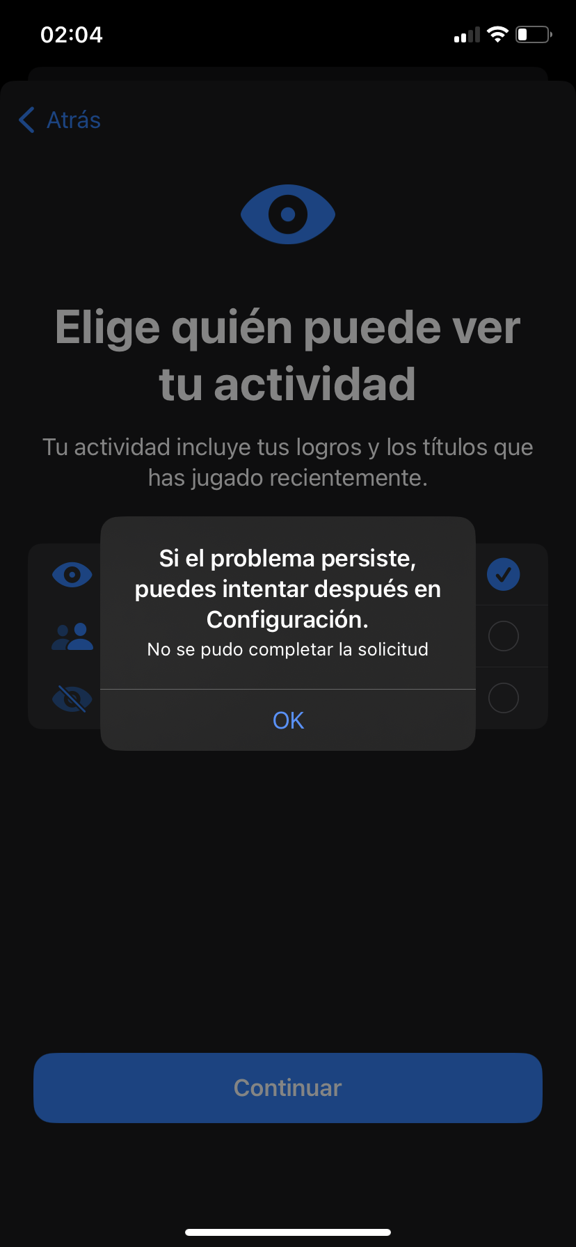 Cuando intento jugar algo me sale que elija quienes pueden ver mi actividad , pero al darle a todo , sólo amigos o solo tu no me acepta