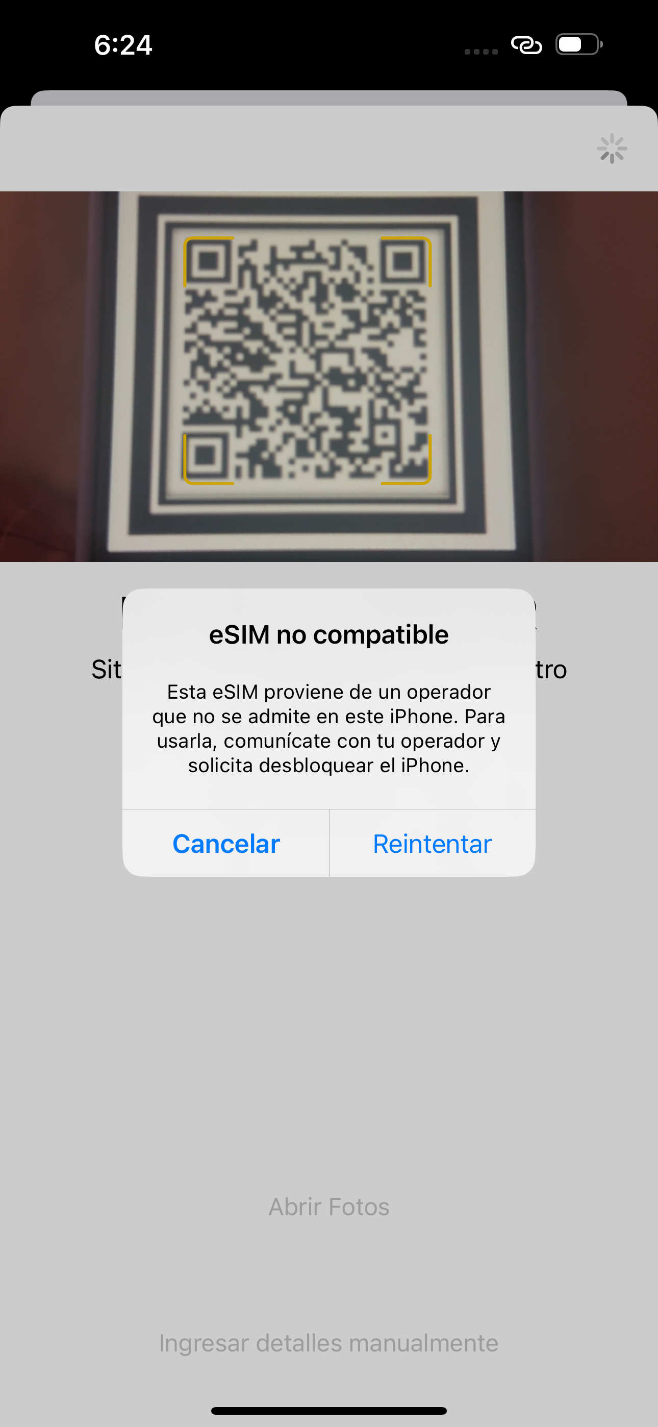 'Esta eSIM proviene de un operador que no se admite en este iPhone. Para usarla, comunícate con tu operador y solicita desbloquear el iPhone.'