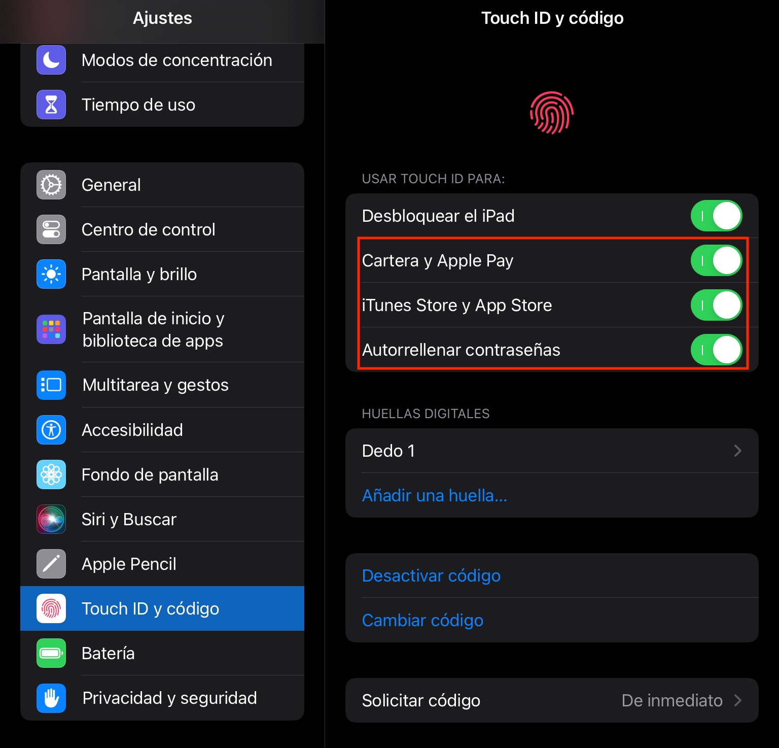 - Accede a Ajustes > Código y Touch ID