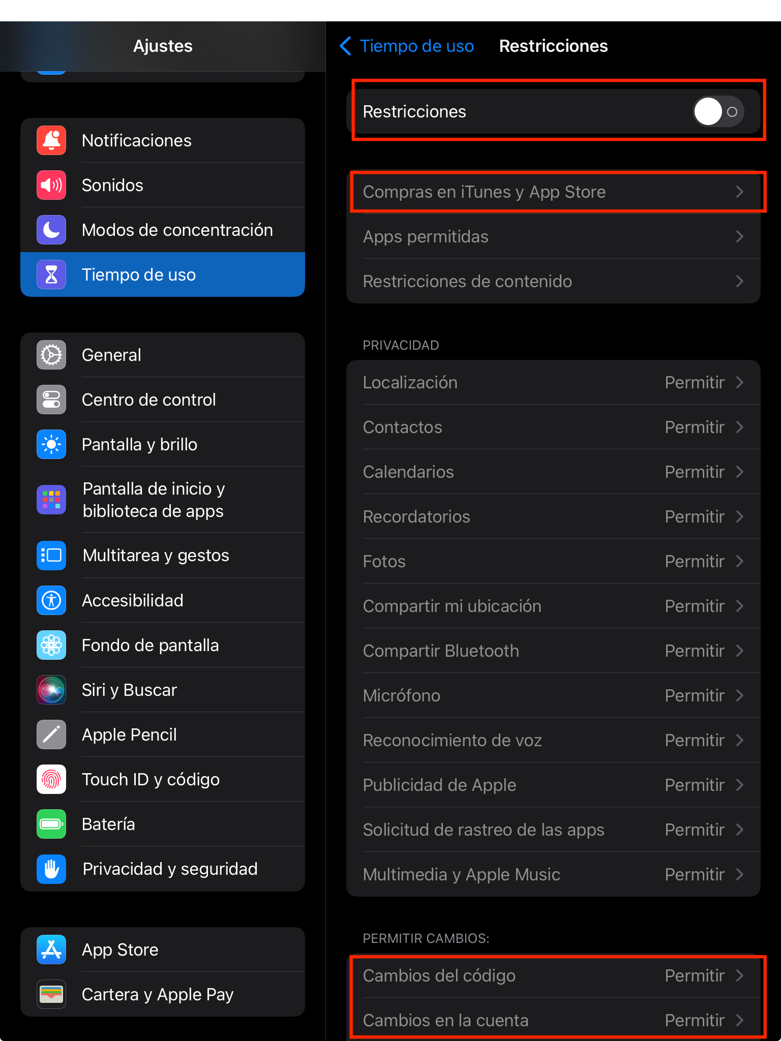 - Vuelve a la pantalla principal de "Restricciones" y desactiva las opciones que se encuentra en la parte más inferior "Cambios del código" y "Cambios en la cuenta"