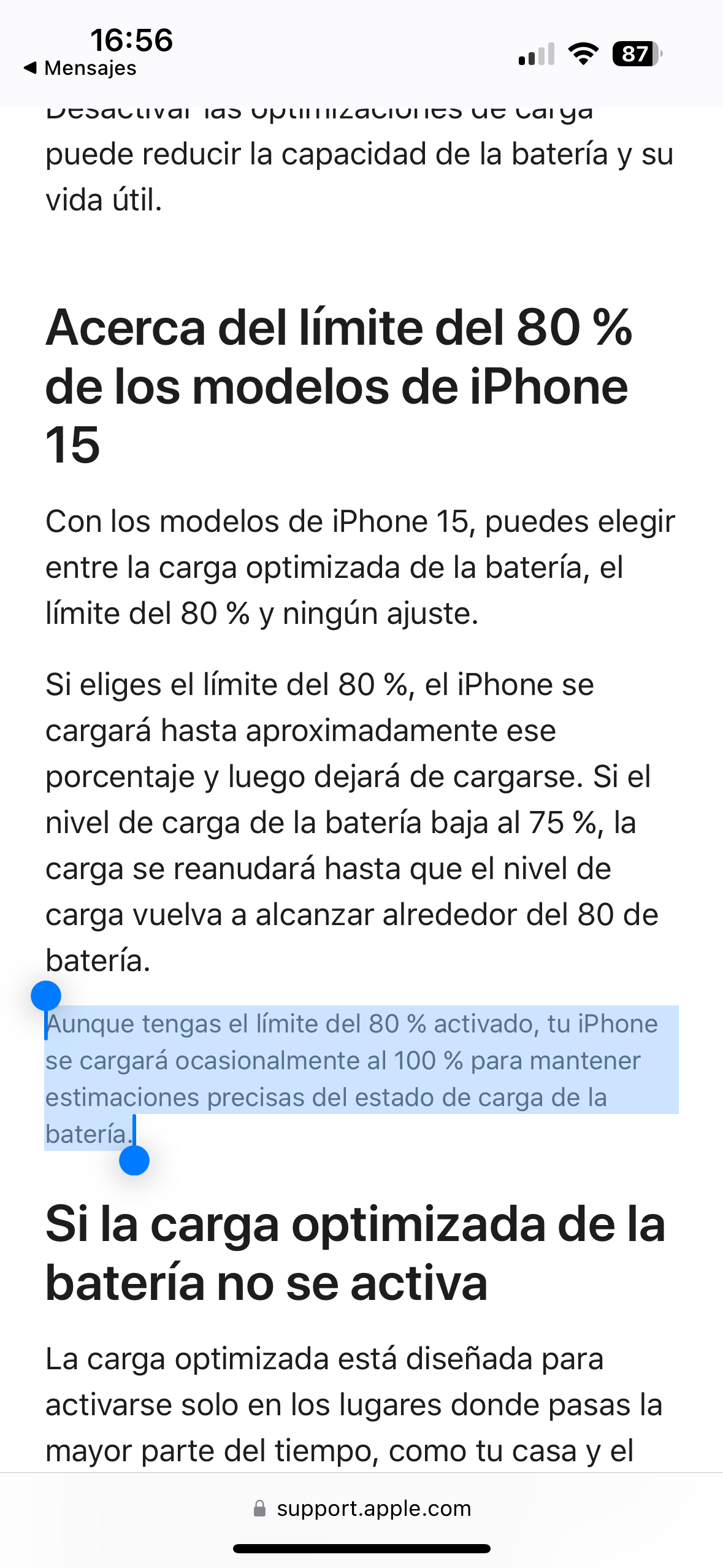 Muy buenas a todos. Vengo a exponer un problema que me viene desde ayer a ver si a alguien más le ocurre…Está seleccionada la carga limitada al 80 por ciento y desde ayer se carga a más. Acaba de hacerme una carga al 100 por 100 teniendo activada “limite de carga al 80 %”. No está seleccionada la carga optimizada, solo el limite al 80. Tengo la ultima version de ios.