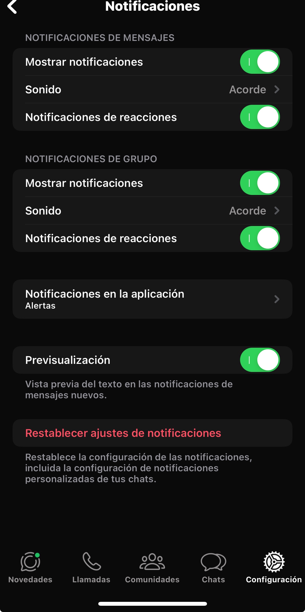 Mi esposa posee un iPhone 14 Pro con 128 GB de RAM, IOS 17.5.1. WhatsApp recibe los mensajes y provee notificaciones acústicas o en pantalla sólo cuando está abierto. Si está cerrado, aún corriendo en segundo plano, nada. Verifiqué que las notificaciones estuvieran activadas, que enfoque esté desactivado, desinstalé y reinstalé WhatsApp, reinstalé IOS desde una PC con Apple Devices, pero el problema persiste.
