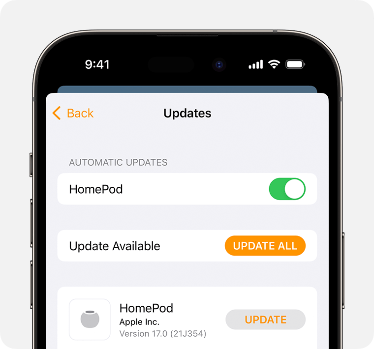 Espere a que la actualización de los HomePod se complete sin desconectar estos de la corriente y sin alejar su iPhone de ellos
