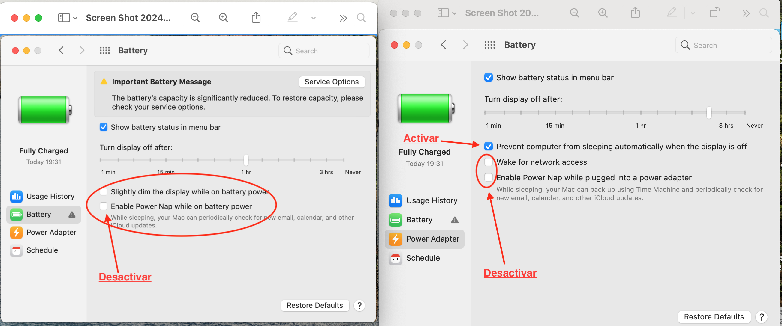 - Enable Power Nap while on battery power [habilitar la siesta energética mientras usa la batería]