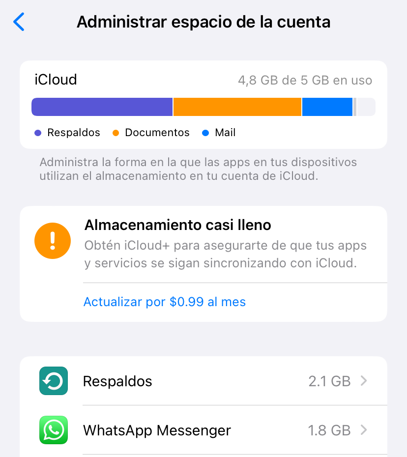 Tengo la versión gratuita de iCloud y en teoría es suficiente. Mi problema es que después de analizar me doy cuenta que los respaldos de WhatsApp ocupan dos veces. Es decir al borrar el respaldo de libera el doble de lo que en teoría ocupa. Lo mismo al hacerlo.