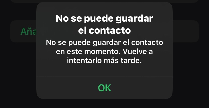 Hola, hace meses que estoy con este problema de no poder agendar contactos, ya probe de mil formas y no puedo, reinicie el telefono de fabrica, está actualizado al ultimo IOS, cerré sesión en iCloud y volvi a entrar, etc. pero me sigue apareciendo ese mensaje de error. Ayuda por favor