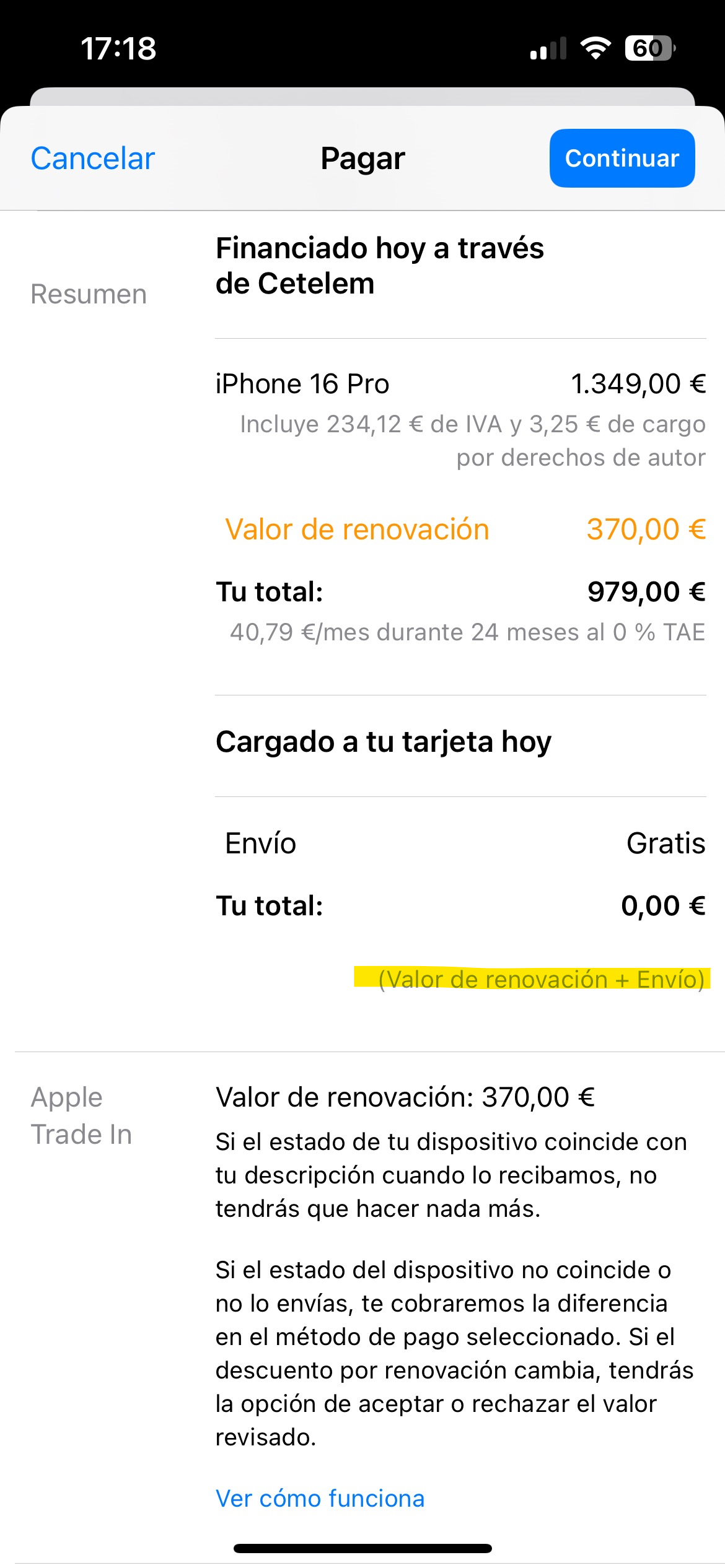 Quería hacer la reserva del nuevo iphone con el trade in del mío pero me quieren hacer un cobro de 370€ que es lo que supuestamente me darían por el trade in.