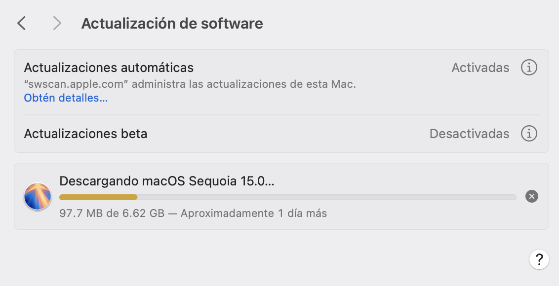 Al momento de correr la actualización a macOS Sequoia, indica que se va a descargar en 1 día entero aproximadamente. Sin embargo, al mismo tiempo actualicé la MacBook Air M1 y en cuestión de minutos se descargó e instaló.