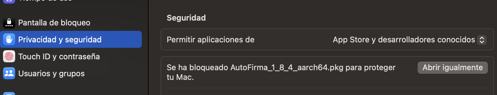 - si no se abre el fichero, abrir el fichero AutoFirma_1_8_4_aarch64.pkg con el botón derecho, para saltar el aviso de seguridad de desarrollador no confiable