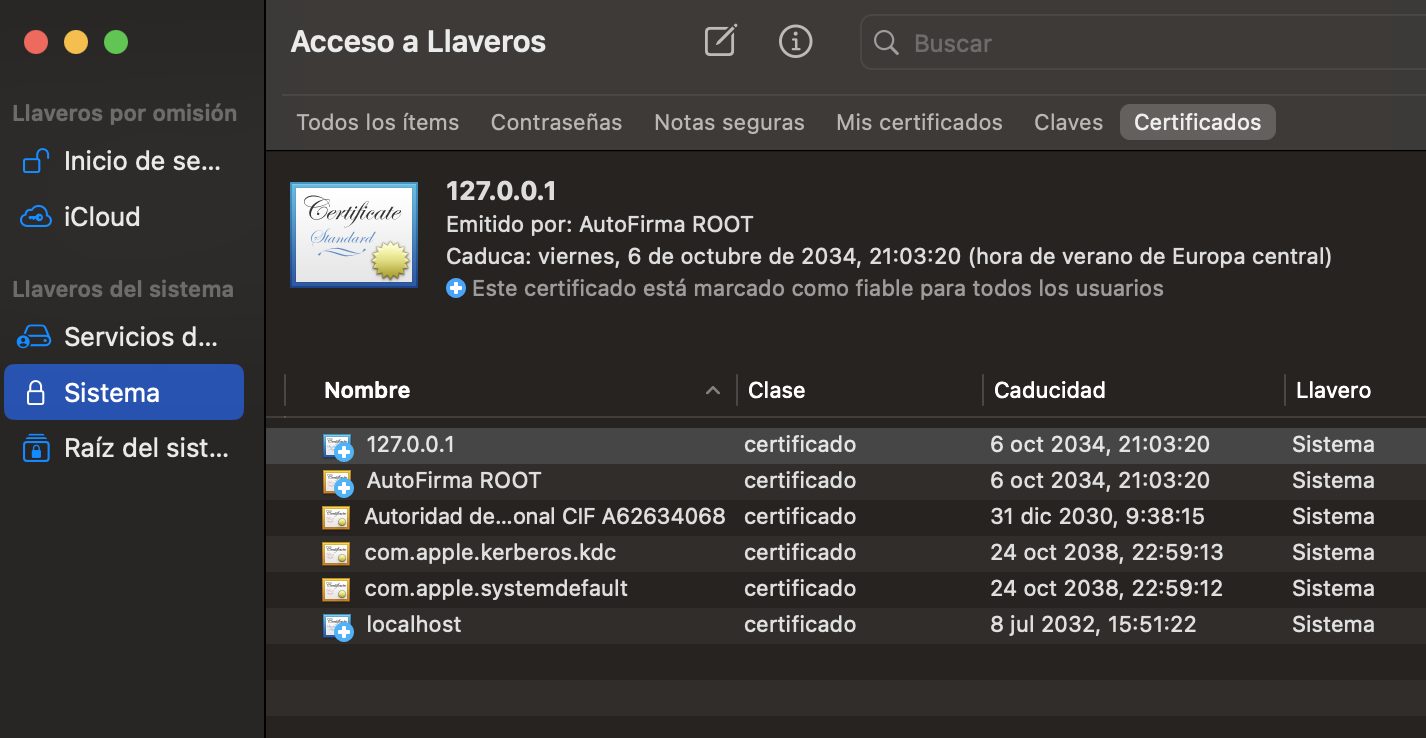 - Desde la app de Llaveros del mac en Sistema --> Certificados