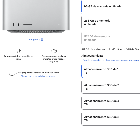 No se puede ampliar el almacenamiento interno de la Mac Studio M1 Max después de la compra, ya que está integrado en el chip.; para tu caso que ya tienes; está la opción