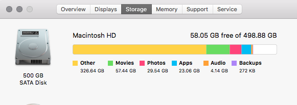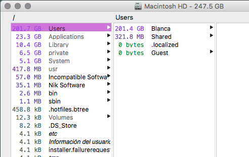 El disco duro de mi mac está casi lleno, según tiene 326GB ocupado en "otros", ya corrí la app omnidisksweeper y ésta solo detecta hasta 247.5 GB usados en total contando apps, documentos, fotos, etc. ¿Cómo hago para que marque lo que realmente debería? Necesito mi espacio extra!! 😕
