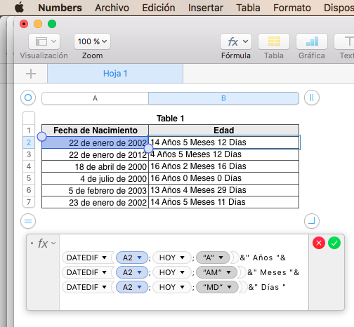 Pero cuando abro la hoja de calculo en numbers no me acepta las formulaciones me sale el siguiente mensaje: No se puede comparar una fecha con un numero porque se trata de tipos de datos diferentes, pero por mas que quiera cambiar para que me quede en fecha ambas no me deja, necesito ayuda para poder formular el documento y determinar la edad.