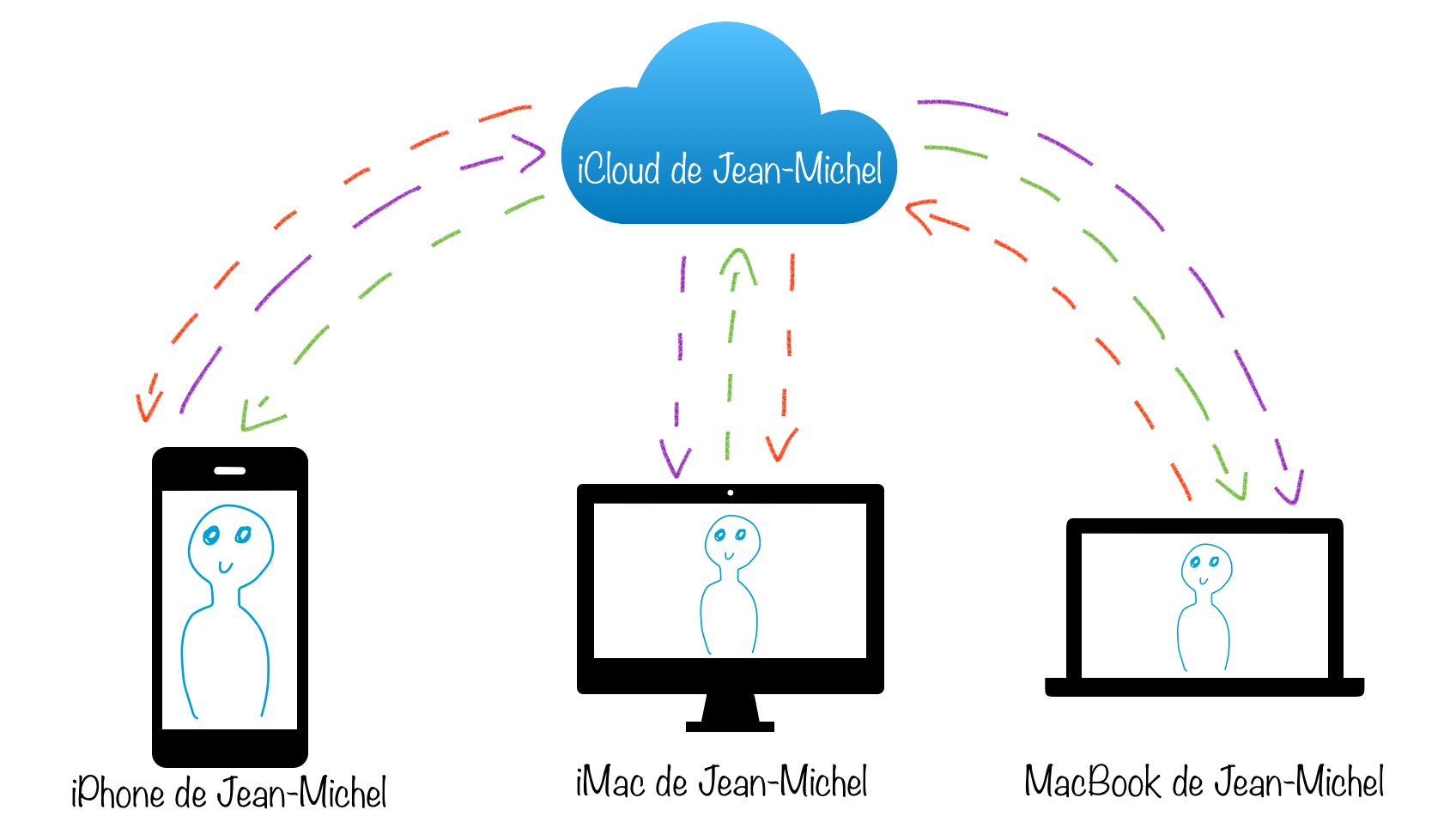 Du coup, parce qu'iCloud sait que tu t'appelles Jean-Michel Pommedapi et qu'il sait que ton iPhone et ton Mac ainsi que ton iPad appartiennent à Jean-Michel Pommedapi, ils se disent qu'il serait pas mal de discuter entre eux. 🗣
