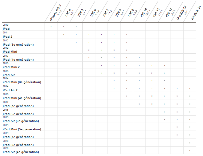 Voici donc, pour vous aider, un tableau récapitulant les versions compatibles avec votre iPad.