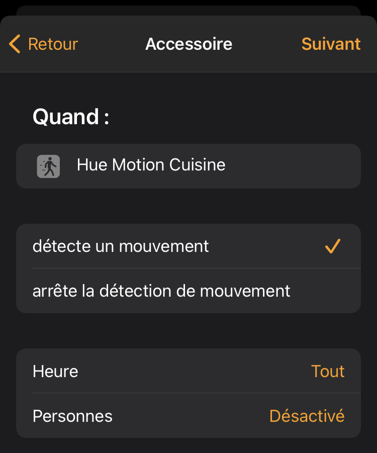 Dans notre exemple, un détecteur de mouvement Philips Hue dans la cuisine. Vous pouvez commencer à mettre vos critères, comme des tranches horaires ou la présence d'une personne spécifique du domicile :