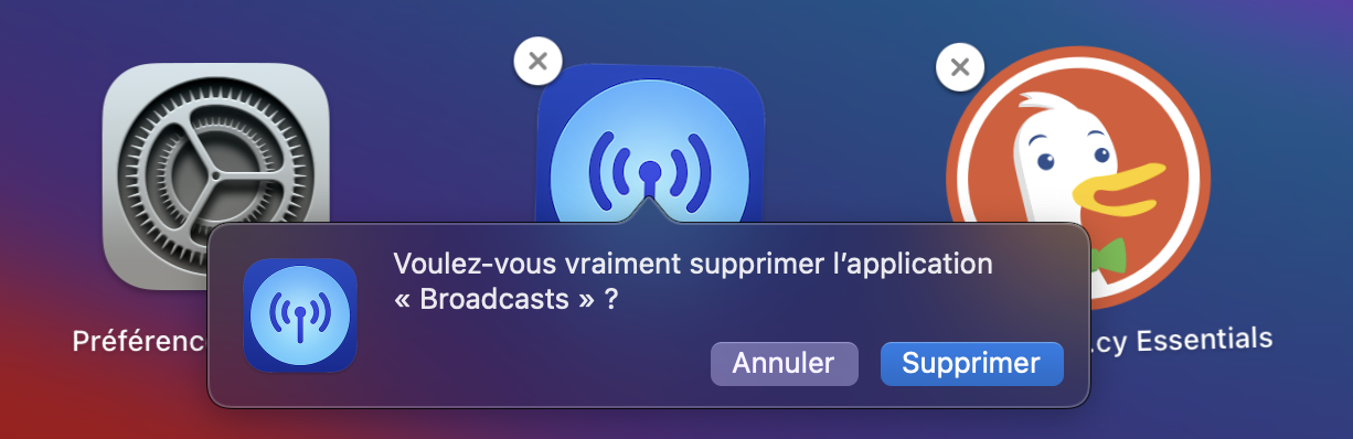 Si l'application en question provient du Mac App Store, alors vous n'avez qu'à aller dans le Launchpad (appuyez sur la touche F4), puis maintenir un clic gauche sur l'application en question jusqu'à ce que celle-ci "tremble". Une fois cela fait, vous cliquez sur la petite croix et vous validez la suppression. 👇