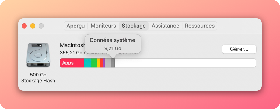 "Cette catégorie comprend principalement les fichiers et les données utilisés par le système, comme les fichiers d’historique, les caches, les fichiers de MV et d’autres ressources système d’exécution. Les fichiers temporaires, les polices, les fichiers de prise en charge des applications et les modules sont également inclus. Vous ne pouvez pas gérer le contenu de cette catégorie. Le contenu est géré par macOS, et la taille de la catégorie varie en fonction de l’état actuel de votre Mac."