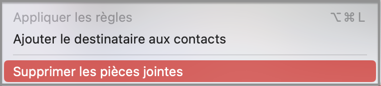 Pour retrouver cette action, on sélectionne depuis Mail un courriel puis > "Messages" "Supprimer les pièces jointes".