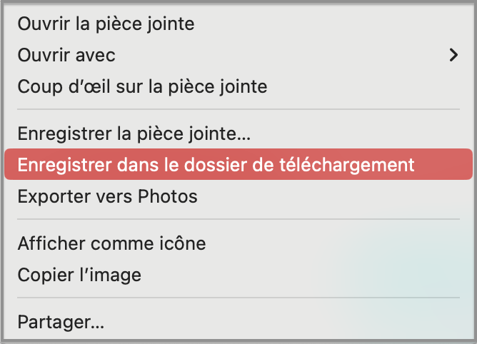 Pour l’enregistrement de l’élément, faites un clic droit sur la pièce jointe puis "Enregistrer dans le dossier de téléchargement".