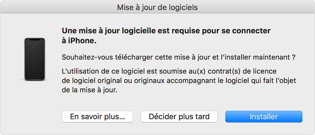 Dans iTunes sous High Sierra, lors de la connexion d’un iPhone (avec un iOS plus récent) à un Mac, iTunes propose parfois une mise à jour logicielle pour autoriser la connexion de l’iPhone et le faire monter dans iTunes. J’ai été confronté par deux fois au même problème (sous iOS 14.1 et iOS 17.2.1), la proposition de la mise à jour logicielle n’était pas proposée et iTunes ne montait plus l’iPhone dans iTunes alors qu’il montait bien dans Photos… Je vous transmets donc la solution car elle peut toujours être utile en 2024…