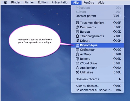 - déroulez le menu "Aller" du Finder, cela tout en gardant la touche alt enfoncée. - vous verrez alors apparaître la ligne Bibliothèque, - vous cliquez donc sur cette ligne pour aller dans votre Bibliothèque personnelle.
