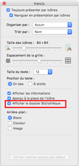 Dans les dernières versions d'OS X, on peut rendre cette bibliothèque visible en permanence :