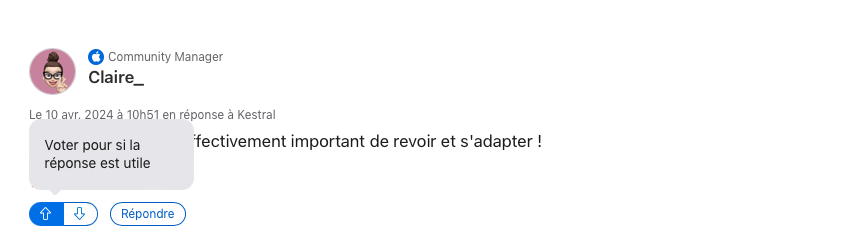 Voter vous donne l’opportunité de partager votre ressenti sur une réponse, la valoriser si besoin, et montrer ainsi aux autres utilisateurs quelles interventions sont les plus utiles. De nombreux utilisateurs parcourent la communauté à la recherche d’une solution rapide et précise. Votre vote leur permettra de la trouver facilement.