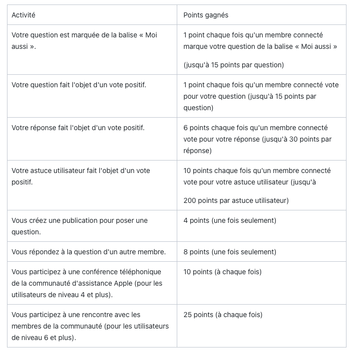 Vous trouverez ce tableau, et plus encore, en cliquant sur ce lien : Partagez vos connaissances et soyez reconnu - Assistance Apple (FR)