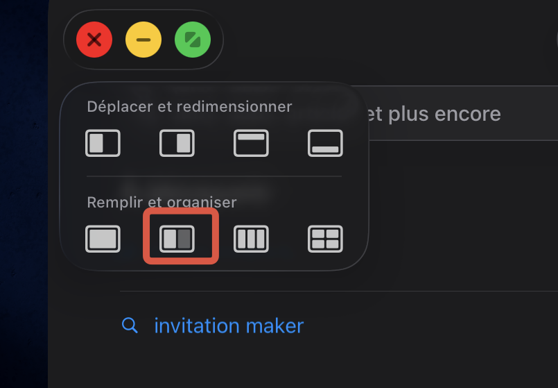 Veuillez touchez les trois petits boutons en haut à gauche d’une fenêtre (🔴🟡🟢)… ensuite veuillez maintenir votre doigt sur le bouton vert et touchez le deuxième bouton dans Remplir et Organiser :