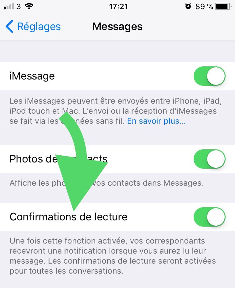Par contre, dans Réglages > Messages > Confirmations de lecture ; tu peux décider de permettre à tes correspondants de savoir si tu as lu ou non leurs messages à eux
