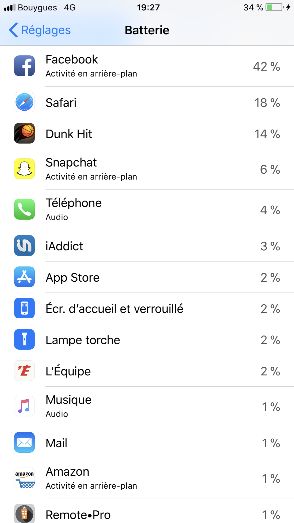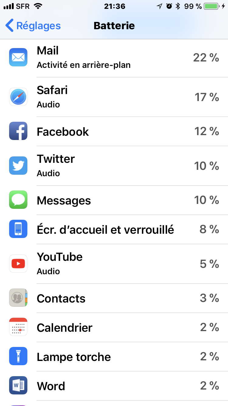 Bonsoir, quand je vais dans les réglages, puis dans batterie pour voir mes applications qui consomme le plus, je tombe sur Facebook qui a consommé environ la moitié de la batterie alors que j’y passe même pas 30 minutes par jour, juste en dessous il y est écrit « Activité en arrière plan ». Mais ce que je ne comprends pas, c’est que j’ai désactivé les actualisations en arrière plan (et la localisation en passant). Je précise que je suis sur iOS 11.1 avec un iPhone 7 Plus, ce problème de consommation excessive de Facebook persiste (pour moi en tout cas) depuis iOS 9.